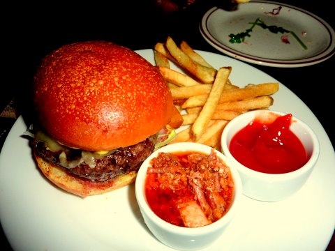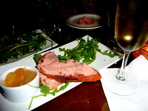 some things i cannot pass up on a menu & chicken livers with toasts is one. the toasts, resting on a bed of arugula, come with a thick spread of liver pate & a ramekin of quince preserves. the combination of rich, creamy liver with the sweetness of quince & peppery greens is luscious. a salad of arugula with a sherry vinaigrette is simple & has a nice acidic kick. sounding too good to save for next time, i ordered the volante burger with aged white cheddar, pickled pepper mayonnaise & bacon jam. yes, bacon jam – piggy, salty, yummy-ness. the burger is so good – tender, not over-mixed, softly seasoned & cooked perfectly. it reminds me of the incredible burger at eccolo (which is no longer) and as it turns out, the chef is one and the same.
