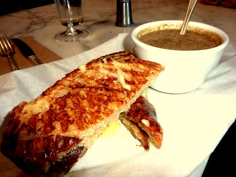 so about my fried pork belly sandwich. it was decadent. it was served on an open-face baguette smeared with fennel mustard & topped with crunchy cucumber, spicy jalapeno & lots of verdant cilantro. resting on top were three large, rectangles of pork belly, cracklins-like on the outside, moist & fatty on the inside. mamma had “the stand-by” – a cup of the soup of the day (mushroom) & a grilled cheese. the earthy mushroom soup was finished with just a bit of white truffle oil & parmesan. the grilled cheese was toasty-cripsy on the outside & oozing melty white cheddar on the inside. she ended her lunch with a tart lemon square sitting in a pool of creme anglaise. the lemon square was good but the creme anglaise was great – i could eat a bowl of it on its own.