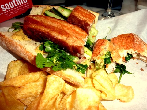 i ate lunch at southie. i had a fried pork belly sandwich. be jealous. southie is a sweet little spot that, at lunch, serves sandwiches, salads & a few sweets. they also serve breakfast & dinner, each with a different menu & each menu changes daily, though some dishes stay put.
